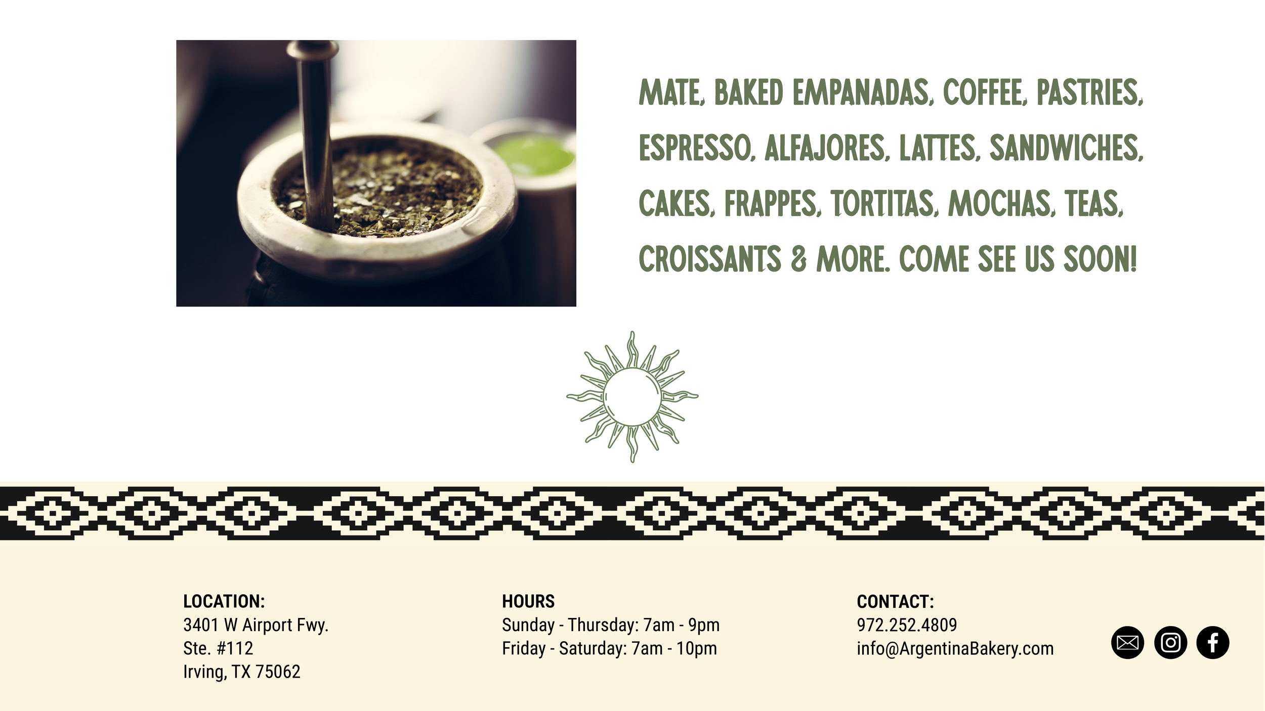*DISCLAIMER - THE CROISSANT PHOTO AND MATE PHOTO ARE PLACEHOLDERS - WE CAN REPLACE THEM WITH MATE AND ALFAJORES OR SOMETHING ELSE FROM ARGENTINA BAKERY BEFORE WE GO LIVE. WE CAN DO THIS AHEAD OF THE FORMAL SHOOT WITH THE PHOTOGRAPHER.