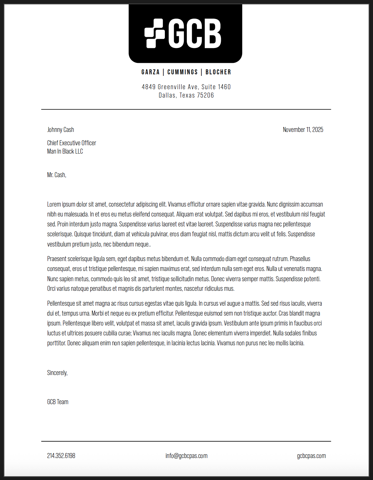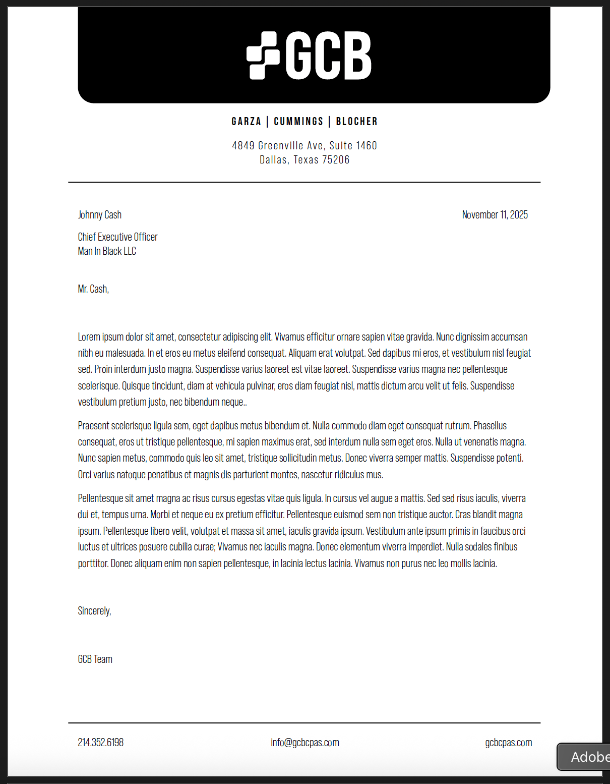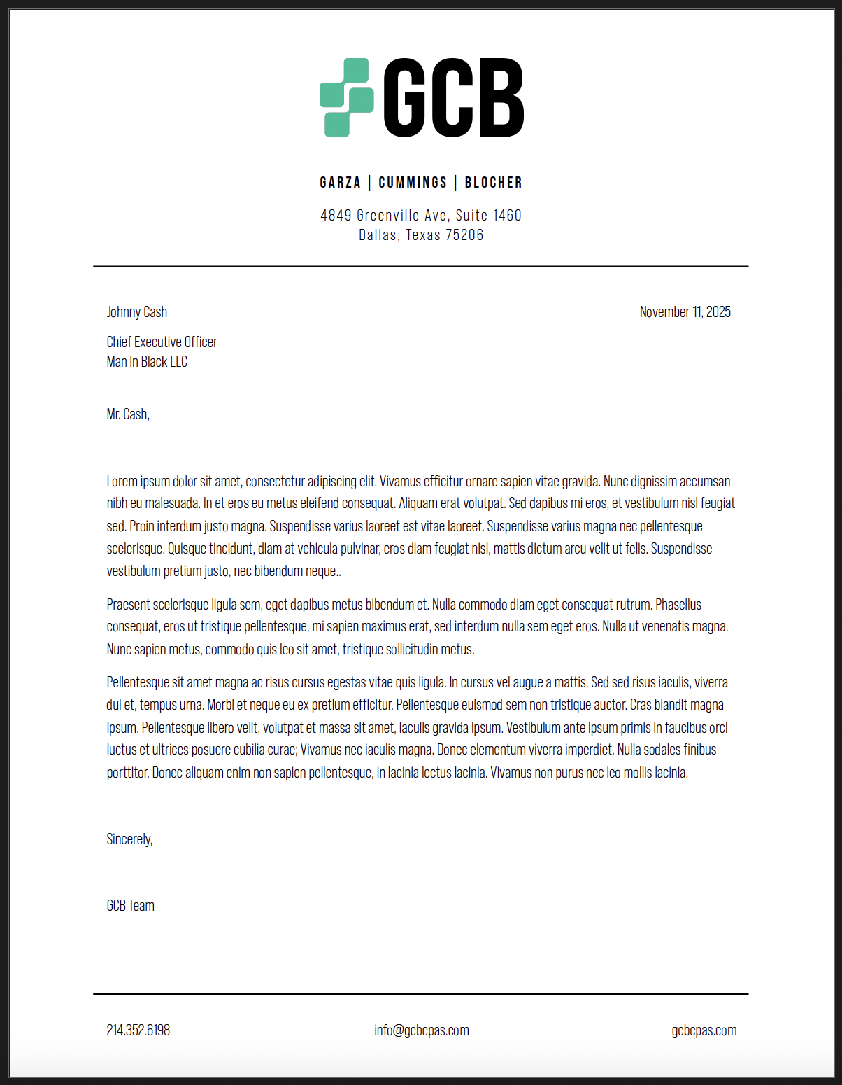 There are five letterhead options for you to choose from or have them all and switch it up as you see fit. They all keep consistent with the GCB brand identity. The range is intentional here, with some being formal and one-color only, while some are more visually modern, each for a different audience/client. These have placeholder/fake copy at the moment, so it’s more about the overall look and composition.