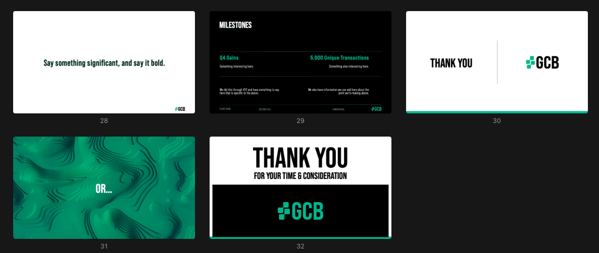 Your custom GCB PowerPoint Template includes over 30 unique slides for a well-rounded starting point to build decks within your brand identity. You can easily further customize the pages by flipping the background color to black and the contents of the page to white. The core master template includes pages with both, to give your presentations variety and make a strong visual impact so your audience stays engaged. It also includes options on the opening title and ending, so you don’t feel that all your decks get too repetitive.