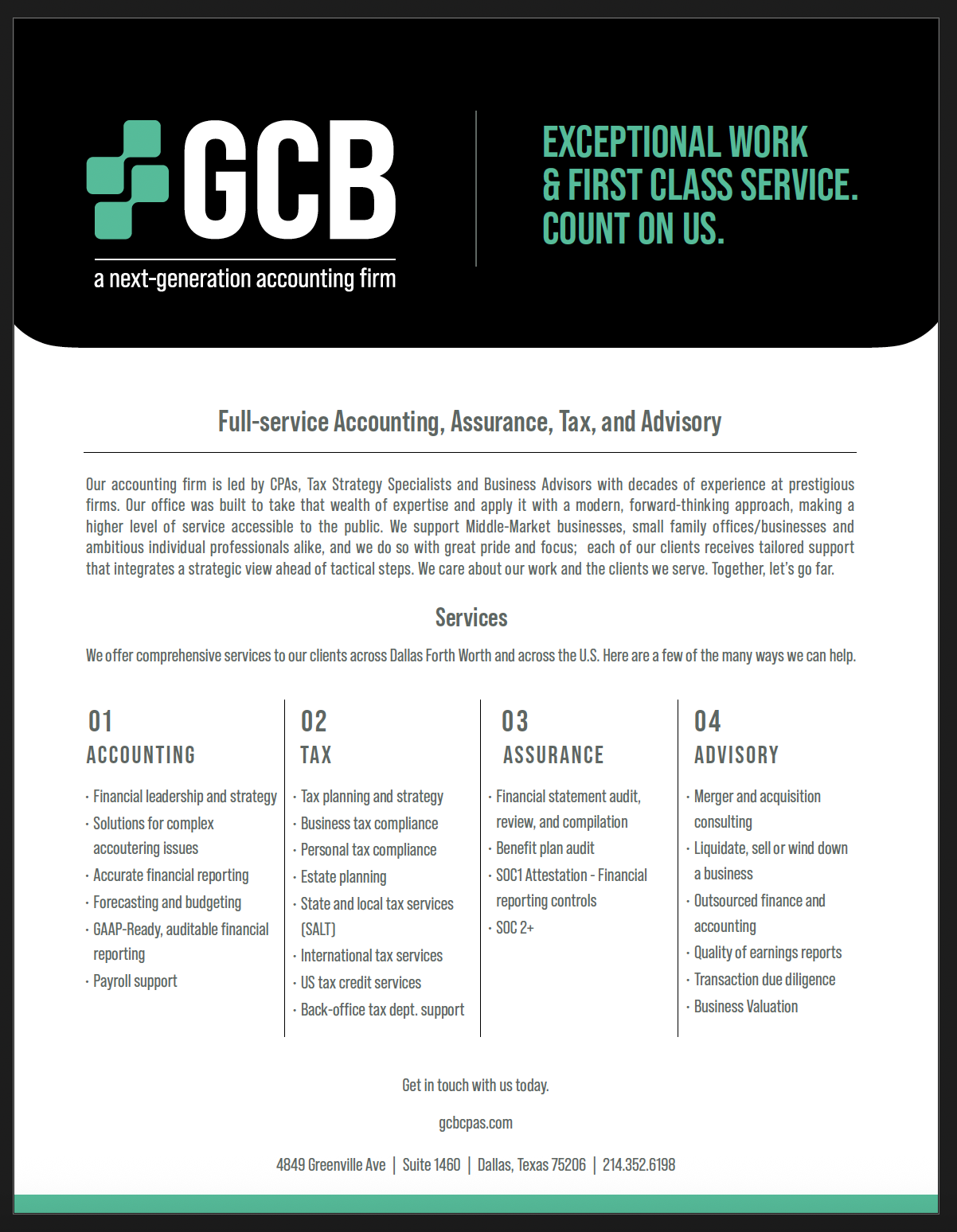 A one-page light intro to GCB you can leave-behind at events/etc. The goal here was to give a strong sense of who you are, showing how far your reach is and how comprehensive your expertise is. It’s a fine line to walk, but it’s enough to validate GCB and lure in customers to learn more. This is a PPT file.